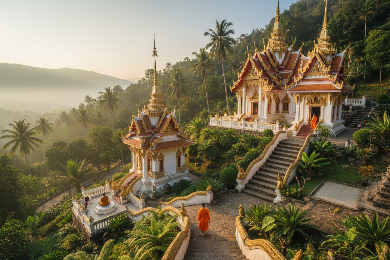 At the top, white stupas and golden spires emerge from the greenery. Monks in saffron robes move quietly through the grounds. The view stretches across the valley--rice paddies, villages, jungle, all the way to distant mountains.